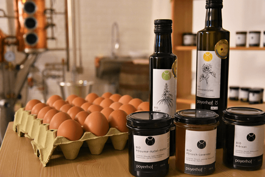 Die frischen Bio-Eier stammen von freilaufenden Hühnern, die frisches Gras picken und ausreichend Bewegungsfreiraum haben. Alte Hühnerrassen wie Maran, Sulmtaler Hühner, Amrock und Brahmas haben hier ihre Heimat. Hanf-, Lein- und Mohnöl zeichnen sich durch die schonende Herstellung aus. Durch den langsamen Pressvorgang und die niedrige Temperatur bleiben wichtige Geschmacks- und Inhaltsstoffe erhalten. Auch die Hanfsamen kommen vom Poyerhof. Sie gelten als wahre Proteinbombe. Bereits eine Handvoll davon deckt den Tagesbedarf an Eiweiß.